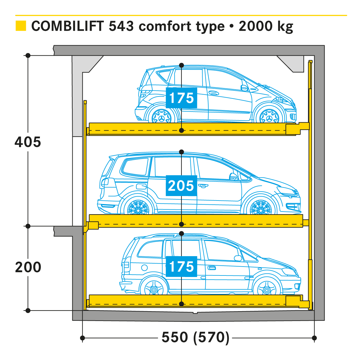 De meest compacte, plaatsbesparende combilift voor het parkeren op 3 niveaus boven elkaar. De inrit bevindt zich altijd op het centrale niveau. Er kunnen 10 roosters naast elkaar geplaatst worden. De gebruiker kiest zijn plaats via het bedieningspaneel of de afstandsbediening. De auto's worden veilig geparkeerd achter schuifdeuren die pas geopend kunnen worden als de gewenste parkeerplaats de gewenste positie heeft bereikt.