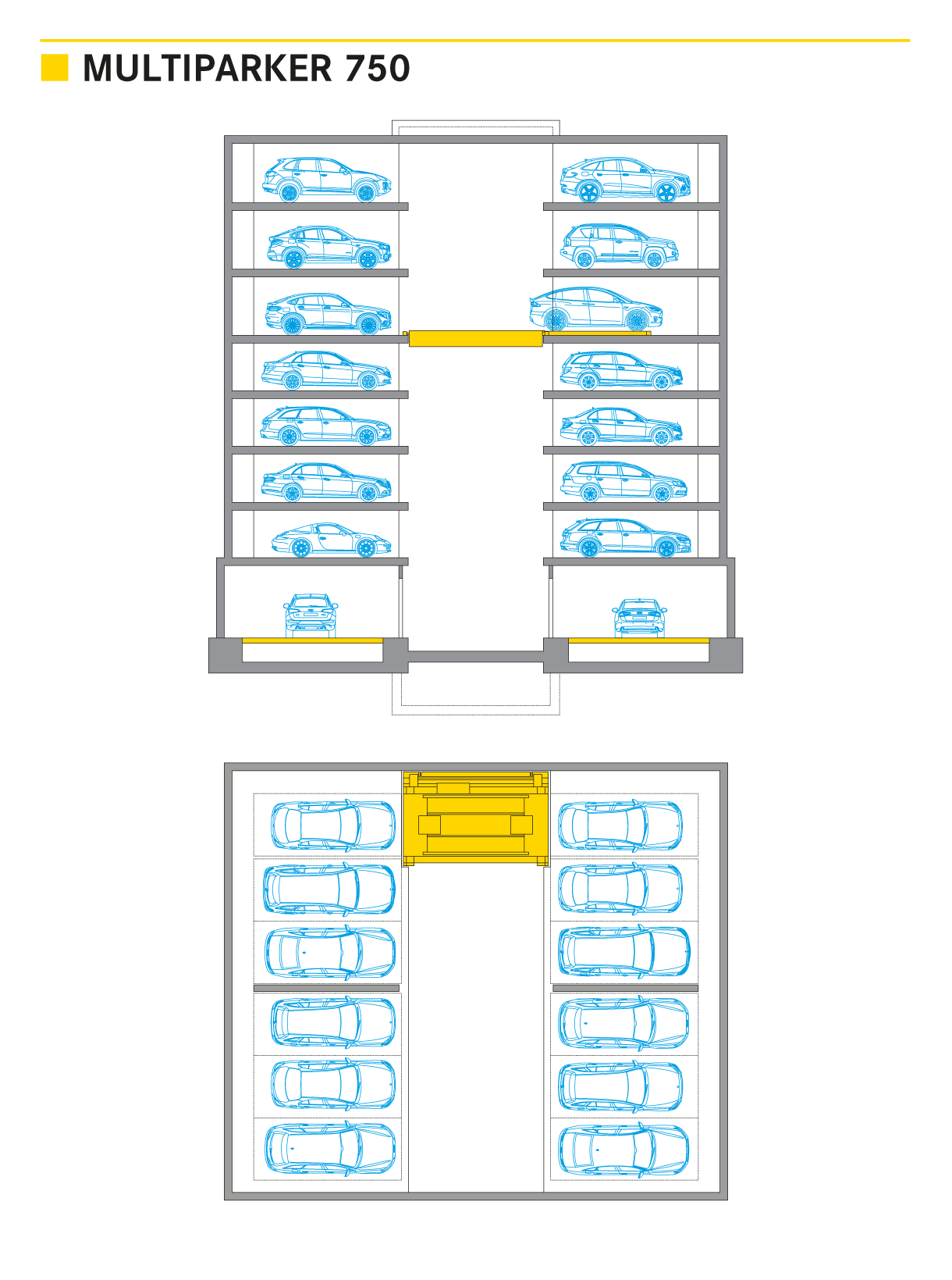 De Multiparker 750 is geschikt voor bouwkubussen, vergelijkbaar met een hoog rek van beton, met toren- of putuitvoering. Deze oplossing is vaak bijzonder voordelig in het geval van ondergrondse constructies en zelfs bij kleine gebruiksoppervlakten met parkeerplaatsen die geschikt zijn tot 30 parkeerlagen hoog. De auto wordt in een van de transferruimten gereden, die door een langsafvoersysteem (LAT) wordt opgepikt, dat de auto met behulp van een shuttle- en verticale lift direct naar de daarvoor bestemde parkeerplaats op de betonnen vloerplaat brengt.